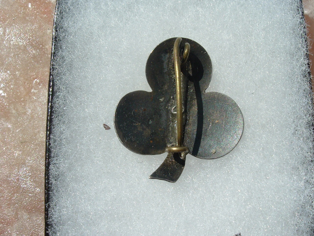 Irish Brigade 2nd Corps pure silver shamrock pin. Scalloped engraved edge, Irish Erin's harp engraved at the top, fancy script initials "D. M. C. C. S. / C. R. G.", above a star, at bottom edge "SALEM MASS". Pin secure on back. Fine condition overall, a stunning Corps pin from one of the most fighting units of the Civil War. Anything associated with the Irish Brigade is highly desirable.