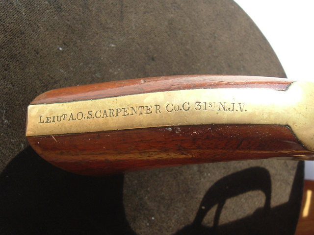 Abram O. S. Carpenter enlisted as a 1st Sergeant on 09/03/1862, he was mustered into "C" Co. New Jersey 31st Infantry, promoted to 1st Lieutenant 02/10/63 and mustered out 06/24/1863. Lieut. Carpenter would have saw action at the Battle of Chancellorsville. Paperwork accompanies this historic revolver.