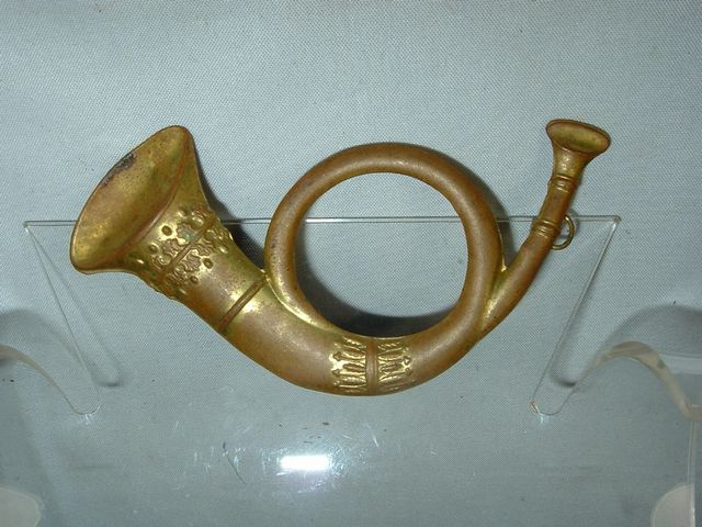 Original Civil War regulation enlisted infantry kepi bugle device. This stamped-brass insignia is fine, as issued condition, with soft age patina and would have been worn on the top of the crown of a kepi. Soldered attachment loops on back.