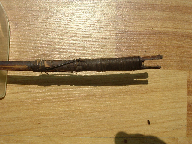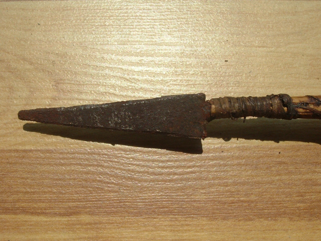 Vintage Native-American arrow, 19.5" overall length, constructed from a branch of a tree, 3" long arrowhead made of metal, which makes me believe this was intended for larger fish. Arrowhead has surface rust from water. Original wrapped twine at both ends is secure and tight. Carved string notch is all there, not broken. Not sure if this would originally had feathers for fishing, but if it did they are long gone. I would estimate this piece mid 1800-late 1800's. A really nice piece, uncommon to find.