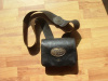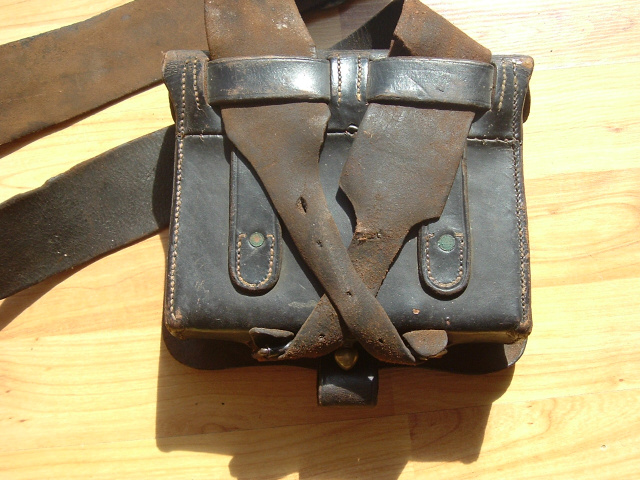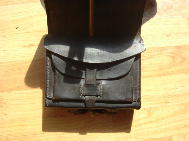 Civil War model 1864 cartridge box with sling, tins and both plates. A nice original cartridge box with sling, .58 caliber. Very good model 1864 cartridge box with die-struck oval "US' plate on the outer flap. Condition overall is very good. The inner flap has a partially legible contractor stamp "[SPRING]F'LD MASS.". The box has all loops on the back, roller buckles, closure tab and brass finial and original tins. The original round brass eagle plate is present on the sling with great detail and golden patina, the sling is very good+.