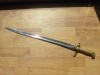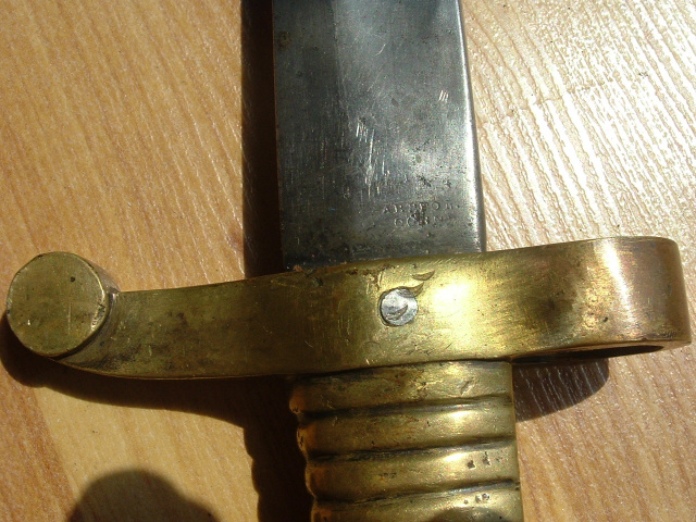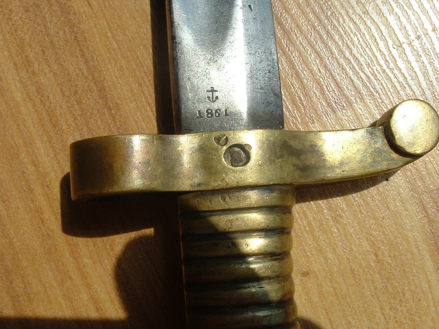 Fine Sharps Navy Rifle model 1859 saber bayonet. Fine condition overall, the blade is full length with a sharp point. retains the original bright finish. The ricasso is marked in an arc "COLLINS & CO (very faint) / HARTFORD / CONN." on the obverse is stamped "1861" below an anchor. Tight fit brass handle with no wiggle. Early #635. Push button functions fine.
