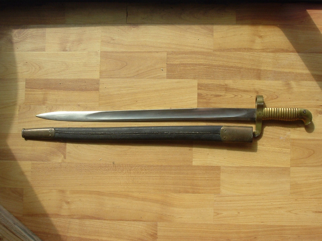 Remington Zouave Rifle Saber Bayonet complete with scabbard. Stamped B.H. on the brass guard, overall 25.5" in excellent condition. Blade shows most of its bright original polish with a little slight discoloration towards the top of the blade. Scabbard is excellent and fits perfect.
