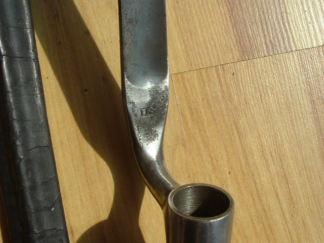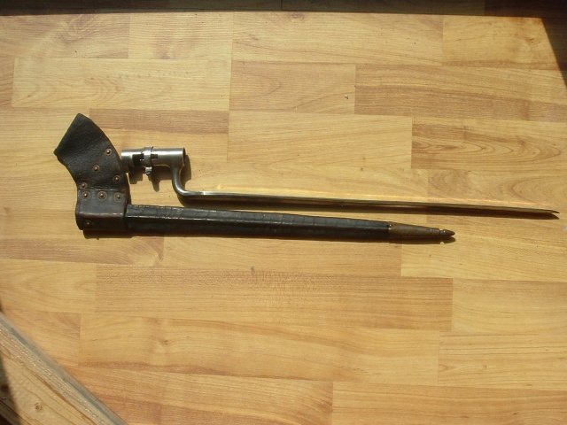 Fine Civil War .58 caliber Springfield rifle socket bayonet complete with scabbard, some surface cracking to leather.
