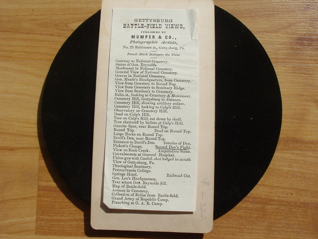 Fine steroview of "THE BATTLE OF GETTYSBURG, PA JULY 3RD, 1863". Artist's depiction, clear images. On the reverse "Gettysburg Battle-Field Views, published by Mumper & Co., Photographic Artists, No. 25 Baltimore St., Gettysburg, Pa.". Very good+ condition overall.