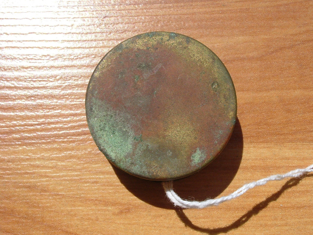 Small round tin for percussion revolver caps. Very good overall, with original top red label "PERCUSSION CAPS / WATER PROOF / 100 W NO. 11 / MANUFACTURED BY THE / WINCHESTER REPEATING / ARMS CO., / NEW HAVEN, CONN.". Label is faded, with some chipped edges. 10 caps.