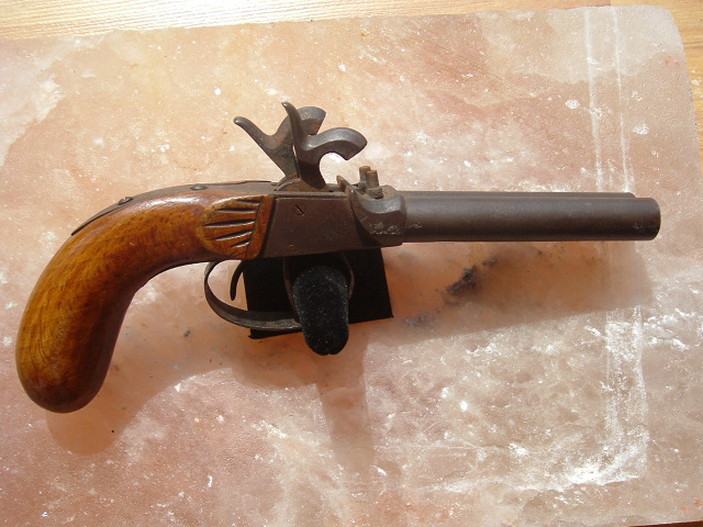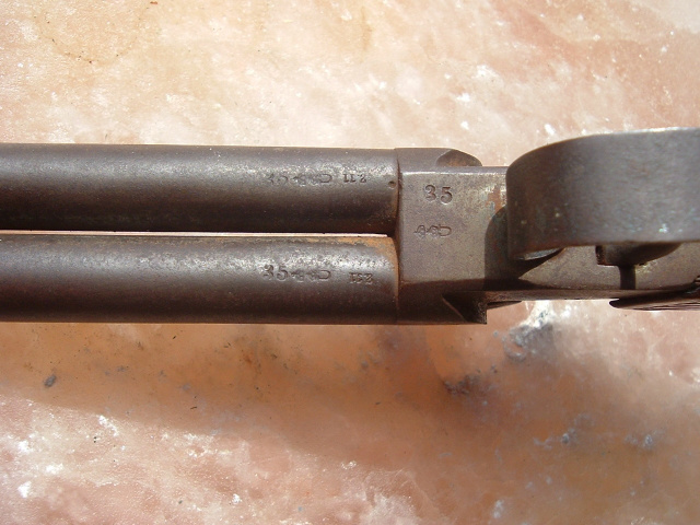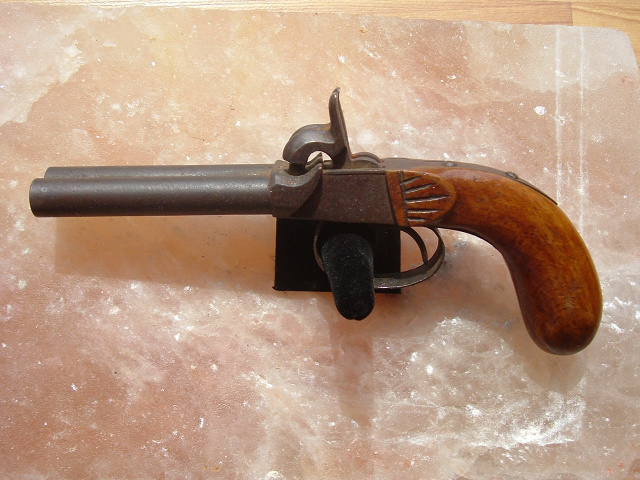 Civil War double-barrel .41 caliber boot pistol, Belgian manufacture. Underside of barrels and frame stamped with matching "35" and other stampings. Approximately 9" overall length. Mechanics are very good on both hammers. Metal overall is an age-brown with some light surface rust between hammers and barrels which would clean up with a light cleaning. The one-piece wooden bag-style grip is very good, A weapon used by both sides during the war for hand to hand combat.