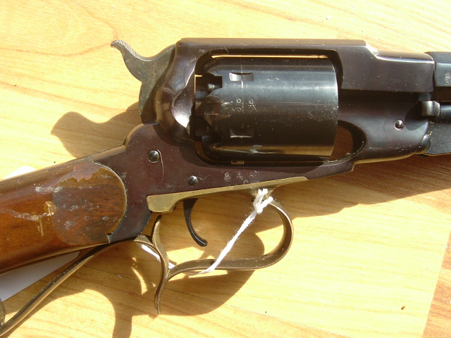 Revolving percussion pistol carbine, percussion .44-40 caliber. Condition overall is fine+. Barrel with adjustable rear sight. Metal components retain .100% blued finish. Brass triggerguard and buttplate are uncleaned. Crisp action. Wood stock is very good with some finish loss mostly around the tang and frame. Barrel, frame and cylinder have Uberti markings. Tang is serial #82748, Uberti manufacture.