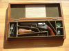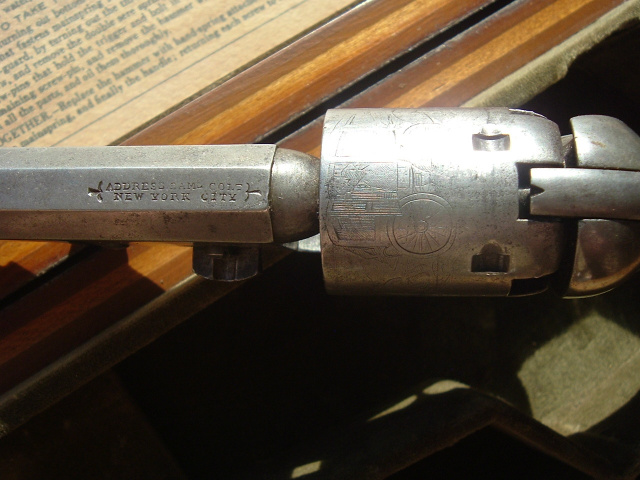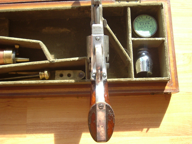 Fine early original Colt model 1849 Pocket model cased with accessories. The Colt Pocket model is an early serial #154227 matching, including wedge, 1859 manufacture. The metal overall is a smooth grey aging patina, the loading lever showing thin case color. The bore is crisply rifled with sharp edges, fine overall. 2-line N.Y. barrel address, 5" barrel. The cylinder scene on the gun is .80%. .90% tarnished silver remains on the triggerguard and backstrap. All markings are distinct and clear. No buggered screw heads. Tight mechanics. The grips are excellent with original varnish remaining. The walnut casing is fine and shows wear really only to the green felt compartments, paper label inside lid on how to load.. It contains: eagle and stars copper pistol flask, original Colts Patent marked 2-cavity brass bullet mold, wooden handle screwdriver, tin of Eley Bro. percussion caps, 2 oil bottles, cleaning rod.