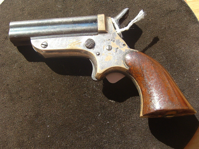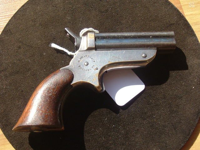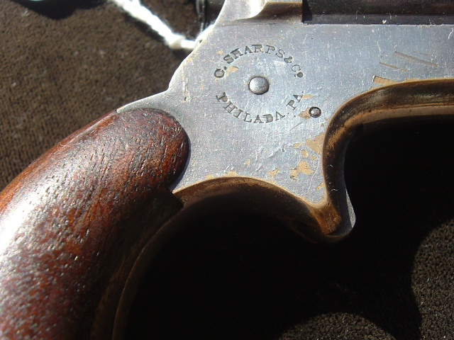 Fine+ Sharps 4-barrel derringer in .22 caliber rimfire. Serial #1966 matching. The markings overall are crisp with the right side of the frame being marked in a circular pattern "C.SHARPS & Co / PHILADA. PA.", while the left side is marked "C SHARPS / PATE[NT 1859]", somewhat worn. Production of these began in 1859 just before the Civil War and many soldiers purchased one to carry during the war. The fluted barrels on this example are smooth with much original blue still remaining. This one has the side barrel release button on the left side of the frame. The brass overall has an uncleaned and retains approximately .75% original nickel overall. Very lovely 2-piece wooden grips, showing original varnish and no cracks or chips. The mechanics are fine, complete with rotating firing pin, often missing. This is an untouched, complete example in fine condition overall of a classic desirable American derringer, much better than most encountered.