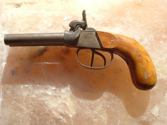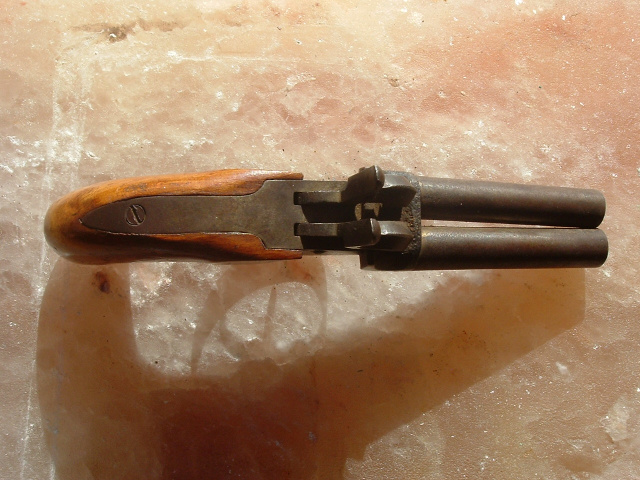 Civil War double-barrel .44 caliber boot pistol, German manufacture. Underside of barrels and frame stamped with matching "96" and other stampings. Approximately 8" overall length. Mechanics are very good on both hammers. Metal overall is an age-brown with some light surface rust between hammers and barrels which would clean up with a light cleaning. The one-piece wooden bag-style grip is very good, A weapon used by both sides during the war for hand to hand combat.