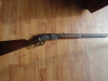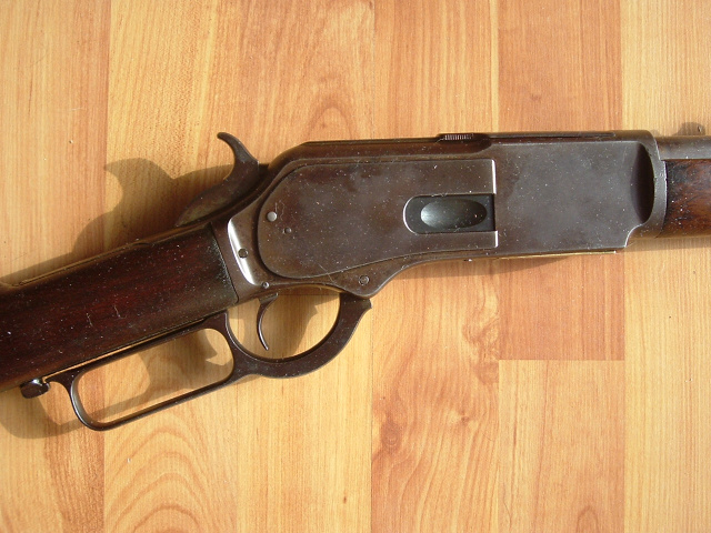 Winchester 3rd model 1876 rifle, .45-60. Serial #34937, 1883 manufacture. Metal overall shows smooth aged light grey mixing with brown patina. Very good .45-60 bore is strongly rifled. Clear markings overall, barrel markings are all they, just wearing thin. Brass carrier block stamped "45-60". Mechanics are excellent holding at both half and full. Original sights. Wood is very good+ and has a beautiful age luster, excellent wood to metal fit, slight age handling wear. Correct crescent-style buttplate with compartment, original dust cover. .100% correct and original '76 Winchester rifle with no issues, fine overall.
