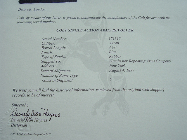 I think one of the bonuses of this gun is that it comes with a Colt letter showing all correct specifications and that it was shipped to The Winchester Repeating Arms Co. 1897. Perhaps is was intended for guard use?