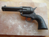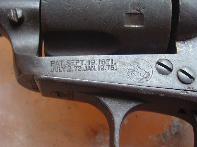 Colt SAA in desirable .44-40 cal., bore is very good, mechanics are excellent, tight crisp action, original Colt grips somewhat worn, no cracks chips or repairs. It has a 4 ¾ barrel with original front sight and very good 2 line Colt address markings and Colt Frontier Six Shooter marked on the left side of the barrel with the word Colt partially visible. The frame has the Colts patent date markings and the rampant horse in a circle markings excellent, Serial #171315 matching, manufactured in 1897. Metal overall has a dark aged patina finish.
