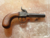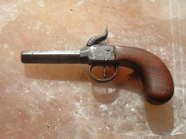 Civil War Boot Pistol, .45 caliber. Screw barrel pocket pistol with British proofing, unmarked as to maker. Octagon smoothbore barrel with dark bore. Iron frame moderately engraved. Walnut bag shaped grip. Action works.
