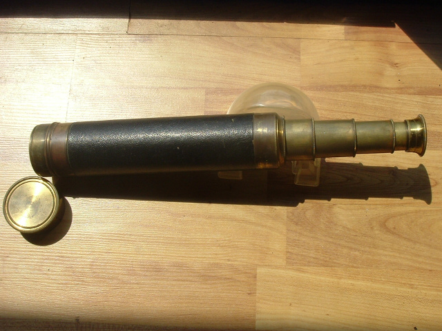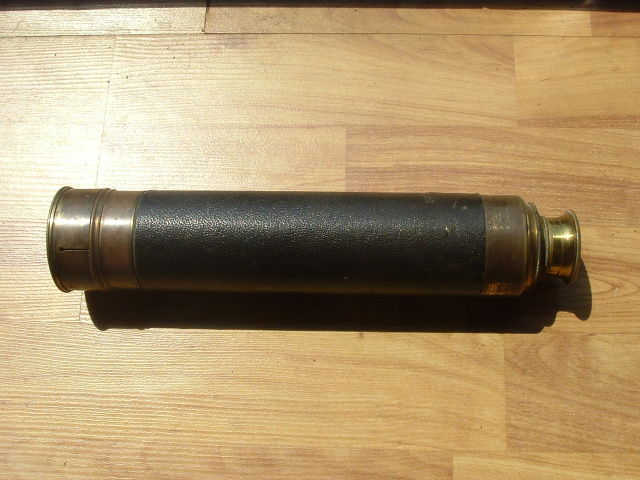 Civil War era "Spy Glass" telescope. This 5-section, 4-pull telescope measures 39.5" open, 11" closed, complete with sliding eye piece cover and brass end round cover, often missing. Leather covered body is very good+ and tight. Brass has a wonderful untouched look. This telescope due to its size would have been carried in the saddlebag.